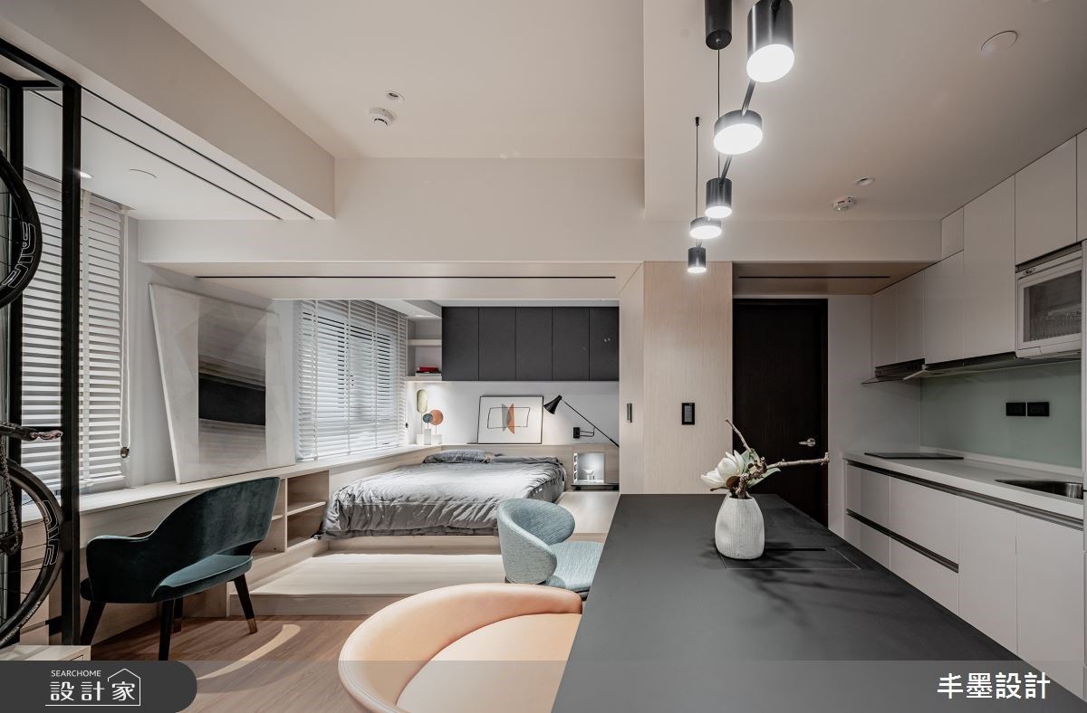 為放大空間坪效,選擇取消實體隔斷,改以開放式設計串聯,白色餐廚將所需機能整合於同一立面,而黑色中島則擴大使用彈性,窗邊梳妝台採光良好,寬敞的檯面整合書桌機能,舒適又強大。為將屋主喜愛的腳踏車妥善展示,選擇於窗邊規劃展示空間,長虹玻璃引入自然採光,同時消弭窗外街景存在感,維持立面簡潔,簡約的背景設計,完美凸顯腳踏車的美感。
