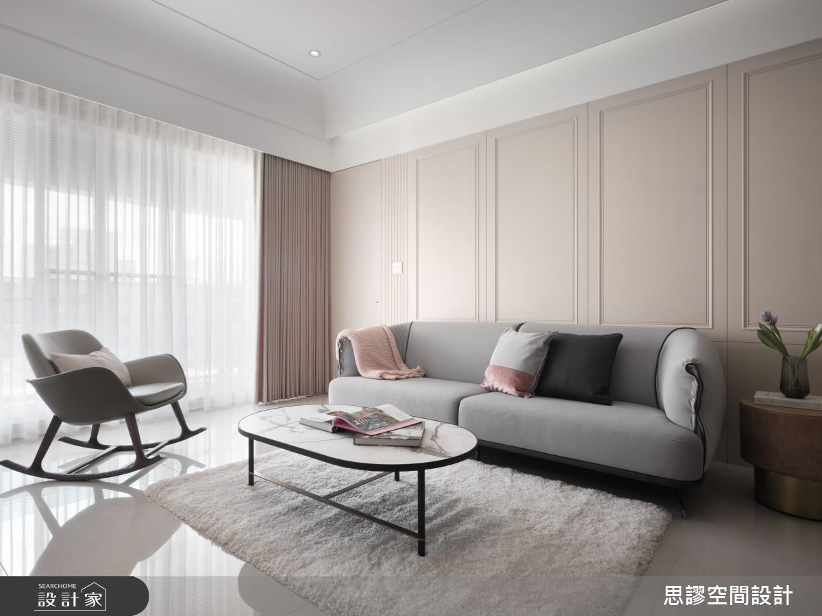 公領域敞開落地窗面,讓充沛採光照亮室內,客廳以柔美的玫瑰粉色調為主,電視主牆額外增添純白大版磚,輔以鍍鈦元素妝點,細膩刻畫一絲華麗質感;沙發背牆使用筆直的美式線板,創造簡約俐落的神情。過渡至餐廳空間,透過暖灰色調的轉變,揭示場域間的分野,而一落不規則的用餐長桌,在柔美的場景裡,意外帶來摩登現代的設計感,彰顯使用者的個性與特質。