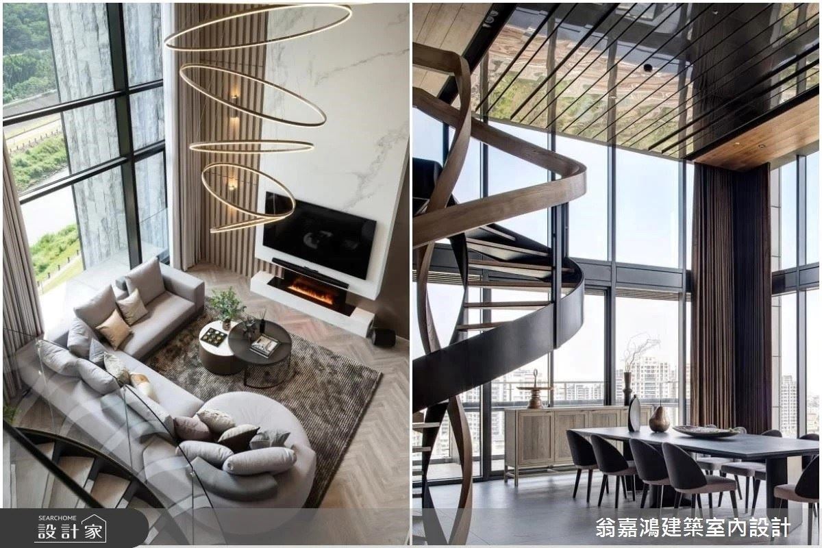 挑高廳區鍍鈦天花結合白色大理石,高聳電視牆延續奢華材質並結合電子壁爐設計,詮釋星級飯店精緻格調。開放式客廳的中央訂製鍍鈦旋轉梯創造自然流暢的回字動線,水平與垂直串連起空間成為生活樞紐。