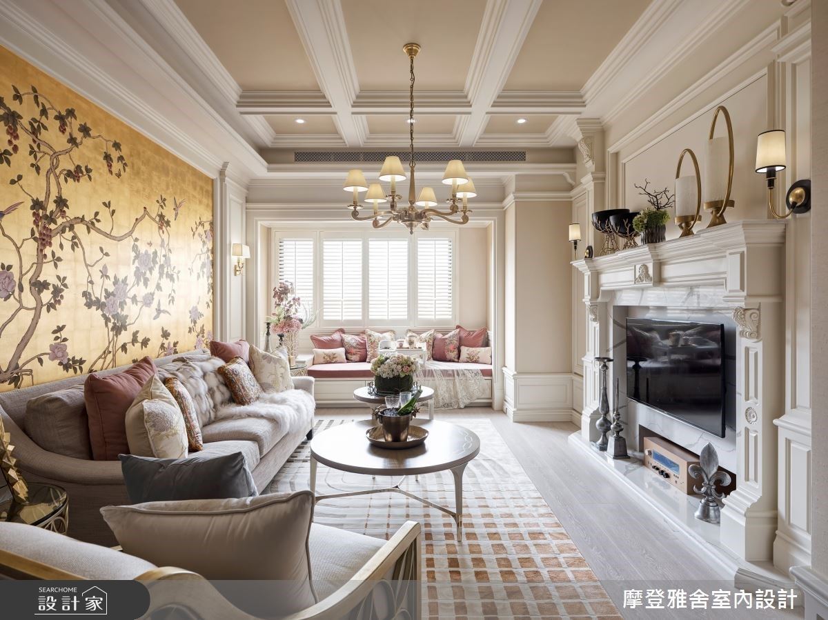 客廳洋溢明亮與暖度,細膩的圖騰花卉賦予了法式新古典的優雅氣質。格狀天花層次豐富,巧妙拉高天花高度,使的空間氣場更大器;以東方花鳥壁畫鋪陳的沙發背牆與西式壁爐電視牆,交織出東西交融的獨特美感。窗邊臥榻與展示平台相連,典雅的木百葉過篩光線,建構出療癒又極具美感的躺臥空間,閒暇之餘還可在此小憩。餐廚區以通透的黑色玻璃拉門區隔,形成一個半開放式空間,以黑色、白色及金色為主軸的色彩,將視覺刺激降低,使五感具聚焦於餐點,側邊花卉壁畫及開放展示櫃,搭配上空間中央的橢圓長桌與復古燈飾,用餐氛圍奢華典雅。