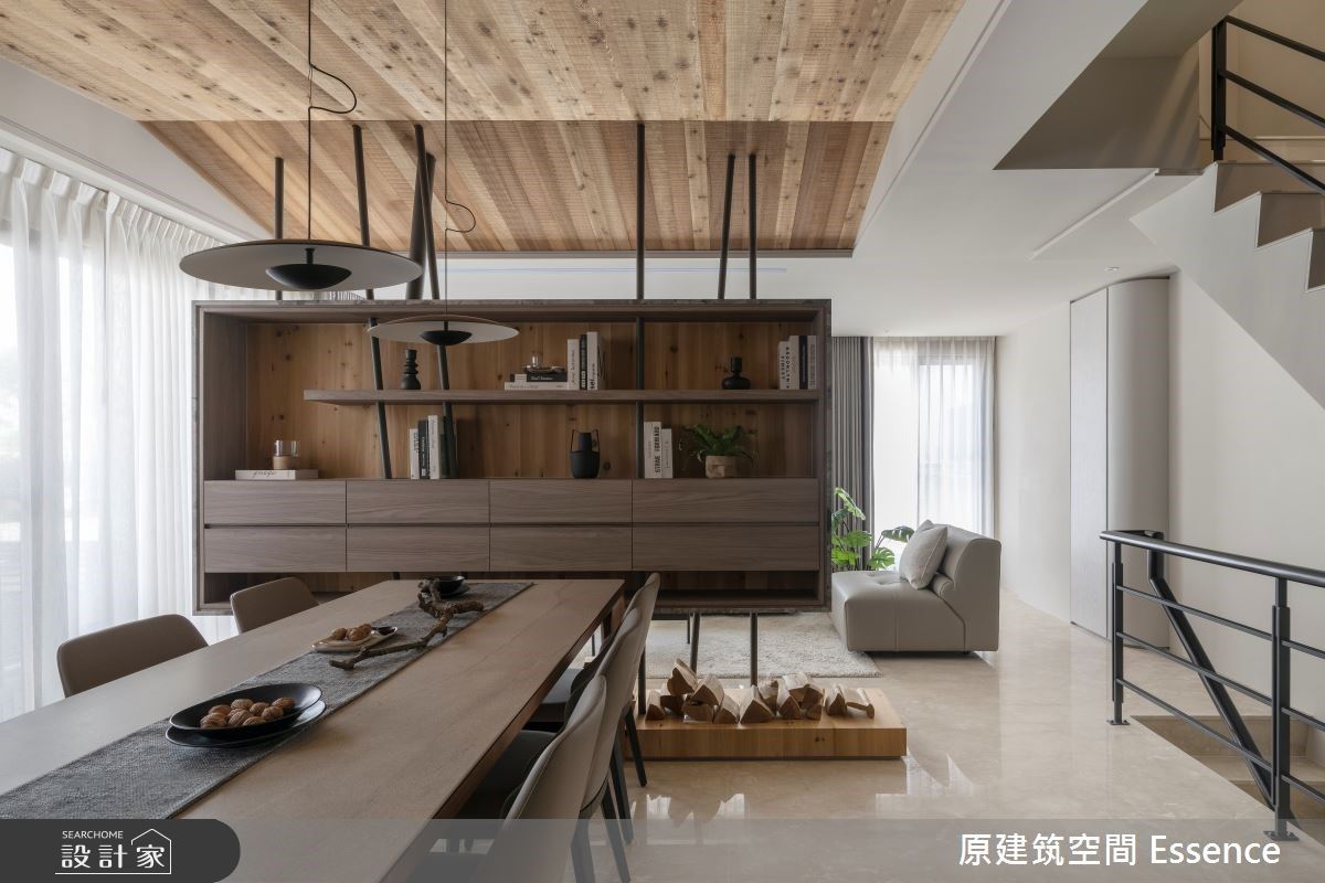 家,不僅是睡覺休息的地方,更是滿足屋主多元生活需求的居所;後防時代,更構築全家人休憩與活動的天堂,共享喜怒哀樂。112坪的透天別墅空間,以渡假小木屋作為設計靈感,透過人文禪風定調,室內鋪敘奶茶色,且搭配大量木紋質地,並以斜面天花呼應木屋意象,創造愜意、溫馨的居所氛圍;為了滿足屋主一家人人健身、瑜珈及兒童閱讀的需求,除了客廳還規劃餐廳、書房與健身房,並藉由玻璃隔間,讓日光盈滿一室,體現明亮、溫暖的宅邸氣息。