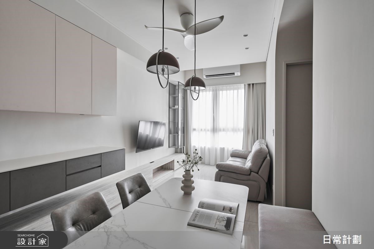 18坪新成屋打造現代風小宅,為了營造紓壓的居所氛圍,且滿足與家人互動、凝聚情感的空間感,整體空間透過燕麥灰為基底,簡約乾淨的線條遊走,創造沉靜與寬敞的場域感;廊道融入圓弧的設計靈感,與方正線條的公領域有所界定,同時創造溫潤的過道氣息;為了滿足家中三位大人的收納需求,延續屋高優勢,爭取櫃體收納機能。