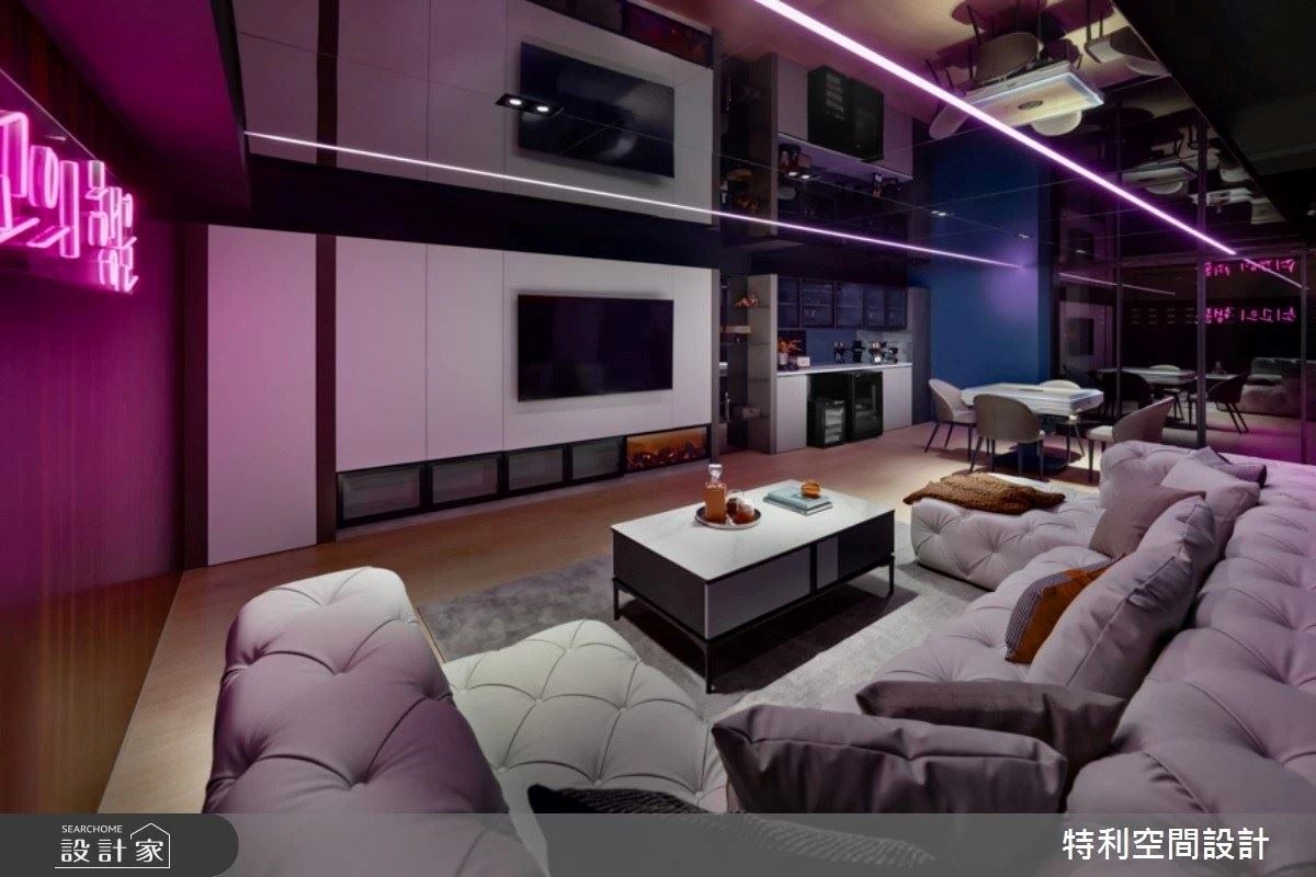 ▲作為整棟樓的重點,在招待所空間,設計師以韓式餐酒館的霓虹燈條作為主視覺,結合智能燈光、鏡面材質、鍍鈦金屬,營造精緻感,同樣是設置 KTV、麻將桌、酒櫃,滿足屋主的生活娛樂,營造高級會館的大器感。