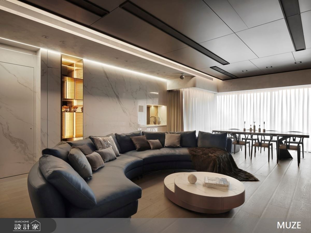 有別於深沈的深灰電視牆,清透的純白大理石背牆,一路自客廳延伸至用餐區,刻意牽起中島吧台與餐桌,賦予便利清潔的IH爐,形塑流暢的料理動線,而立面將收納空間、酒櫃設計整合,讓烹飪空間一展乾淨清爽的面貌。走入私領域,維持深沈的大地色調,鋪陳綿密細膩的格柵線條,與純白大理石相接,映照來自落地窗的明亮光感,而衛浴空間隱身牆後,維持必要的機能配置,卻不會破壞整體的和諧感。