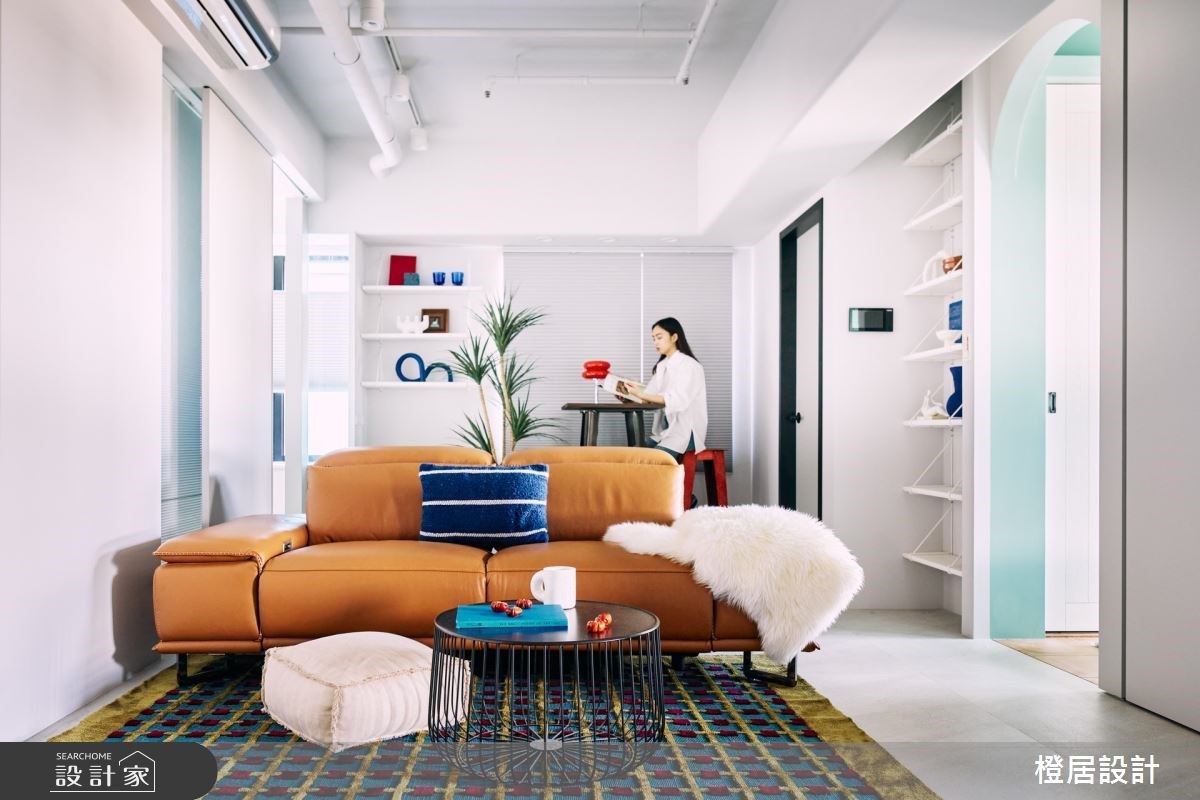 玄關鋪設清水藍地磚圍塑獨立落塵區,月雲藍懸浮櫃體部分封閉部分開放,符合各式收納需求,也達到美型收納,平台也可以擺放鑰匙或隨手小物,布置穿鞋椅、綠意植栽和藤編提籃,烘托出宛如熱帶國家渡假的既視感,一回家就立刻轉換好心情。公領域串聯客廳、開放式廚房,放大空間視野,暖橘色簡約的皮沙發和鮮豔的撞色地毯,無形中劃分出主要的休憩場域。拉門式電視牆面可移動調整到適合的觀看角度,也能適時隱藏收納櫃,機能十足。開放式廚房防濺板跳色,時尚又吸睛,新增中島擴大料理及用餐檯面,也挹注休閒氛圍,閒暇之餘在中島輕食小酌,緩慢生活步調超愜意。窗邊樑柱下方的畸零空間打造開放式平台與收納,展示屋主珍藏的藝術品,窗邊規劃為閱覽區,擺放仿舊桌椅及赤陶色系注入人文質感,充分利用廊道空間,營造整體視覺方正,卻又不失實用性,坪效超放大。