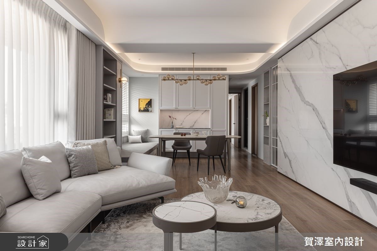 餐廳場域,沿著純白的木百葉窗邊,配置一道舒適的臥榻設計,銜接輕奢的大理石餐桌、輕透玻璃吊燈,隨時陪伴女主人進行愜意的下午茶時光;後方的純白收納櫃,延續自然的大理石元素,藉著簡潔的美式線板,傳遞典雅優美的歐美情調,反映使用者的品味與美感。