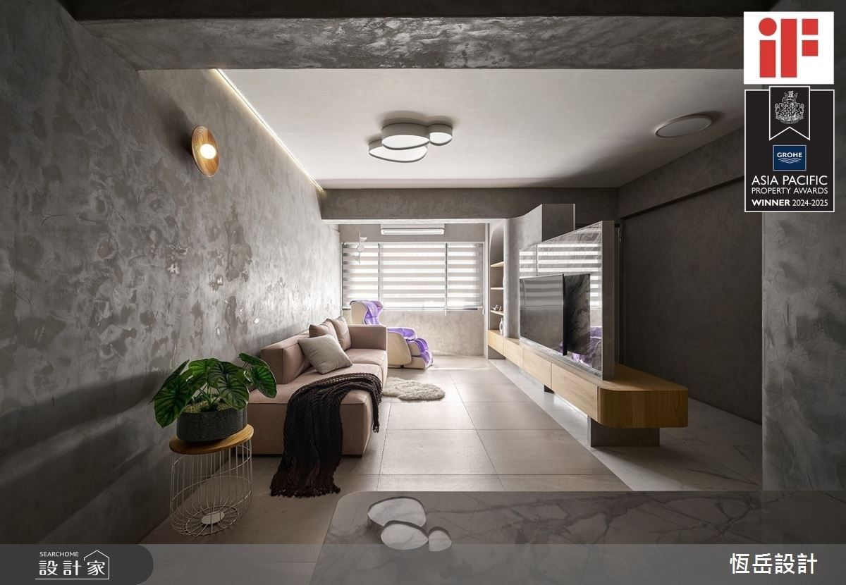 30 坪的老房子,已有 35 年的歲月積累,壁癌、漏水和管線老舊等問題也浮於眼前,再加上低矮的屋高和不合時宜的動線,讓屋主一家三口和愛貓的新生活處處受限。在恆岳設計團隊的規劃下,拆除了不必要的隔間疆界,鋪敘細膩多變的灰調漆面及大理石紋理,渲染出沉靜而仛寂的居家場景,更獲得德國 iF Design Award WINNER 及 Asia Pacific Property Awards WINNER 等兩項指標性國際獎項榮耀!