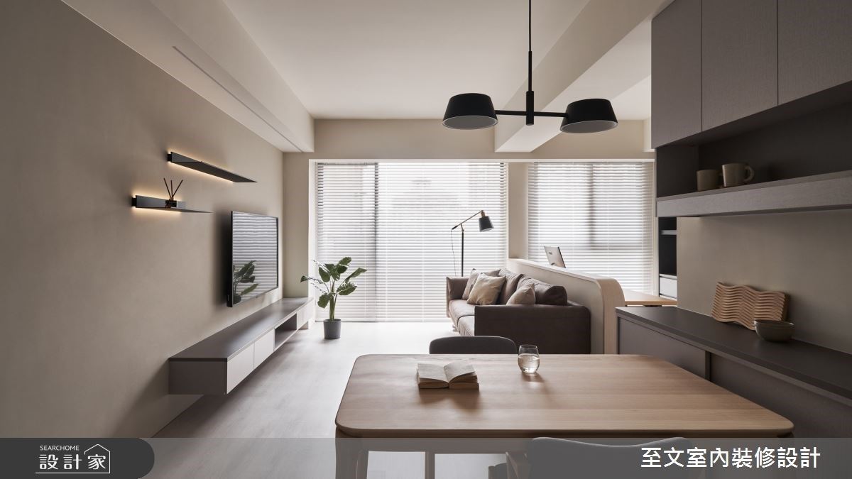 當你進入一個 22 坪大的住宅空間,一眼望去明亮寬敞的廳區帶著低調內斂的裝潢設計,大隱於市的寧靜氛圍下,散發著溫暖而寧靜的氣息;由木地板、木作貼皮、油漆塗料調和,輔以鐵件勾勒出些許的陽剛氣,呈現帶有侘寂感的工業風。大面採光透著百葉窗柔和地灑落空間,鑲嵌於樑柱的燈帶以最溫柔的方式打亮整個公領域。沒有過多裝飾但充滿細節的住宅樣貌,就是至文室內裝修設計對單身男子生活的最佳摹寫。