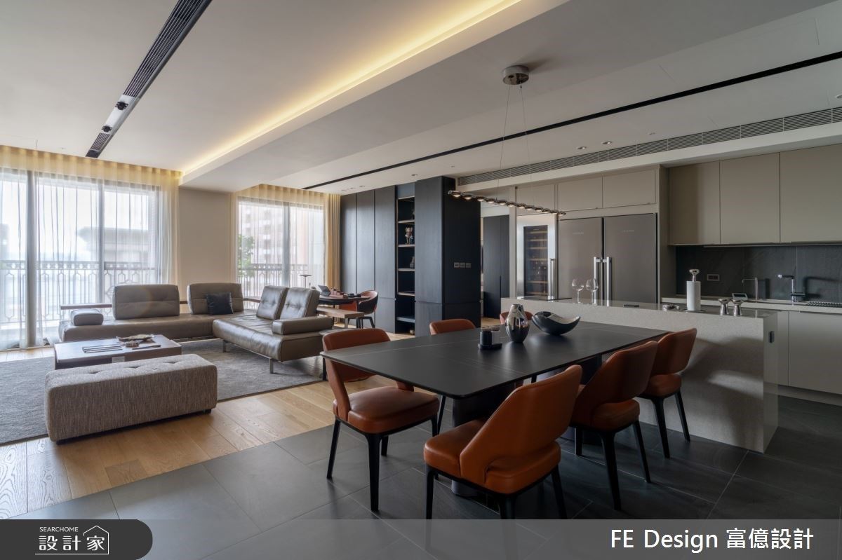 開放式餐廚區是生活的核心,長型中島結合餐桌,搭配大膽的愛馬仕橘色餐椅,為空間注入活力。雙開冰箱與紅酒櫃提升了居家機能,滿足屋主對於生活品質的講究。而客廳電視牆以幾何切割的大理石鋪陳,搭配落地音響,營造出沉浸式視覺與聽覺饗宴。