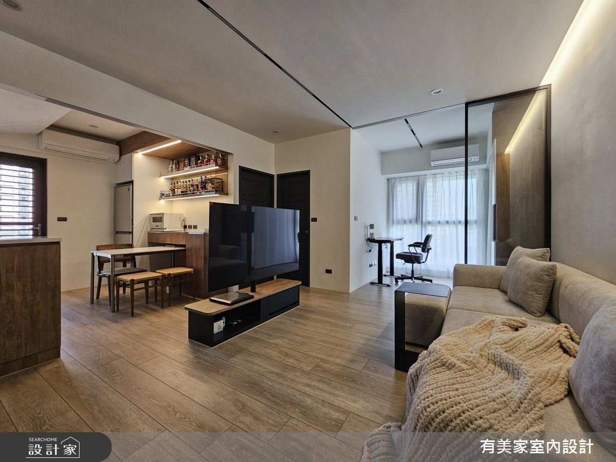 19 坪新成屋在規劃空間時,有美家室內裝修團隊仔細確認屋主收納習慣與生活需求,原三房規劃調整為 2+1 房配置,將閒置的臥室改為開放式書房;廚房也在建商配置的基礎上做了升級,訂製中島整合廚餘垃圾桶與零食櫃。針對屋主許多威士忌收藏,在用餐區牆面以不鏽鋼和茶玻建構出展示收納酒櫃,完美整合餐廚空間。主臥則是依照屋主需求規劃獨立更衣間,並運用木質元素創造溫馨的混搭風居宅,從風格、格局到機能皆貼合日常需求訂製,讓一家三口帶著歡愉的心入住新居!