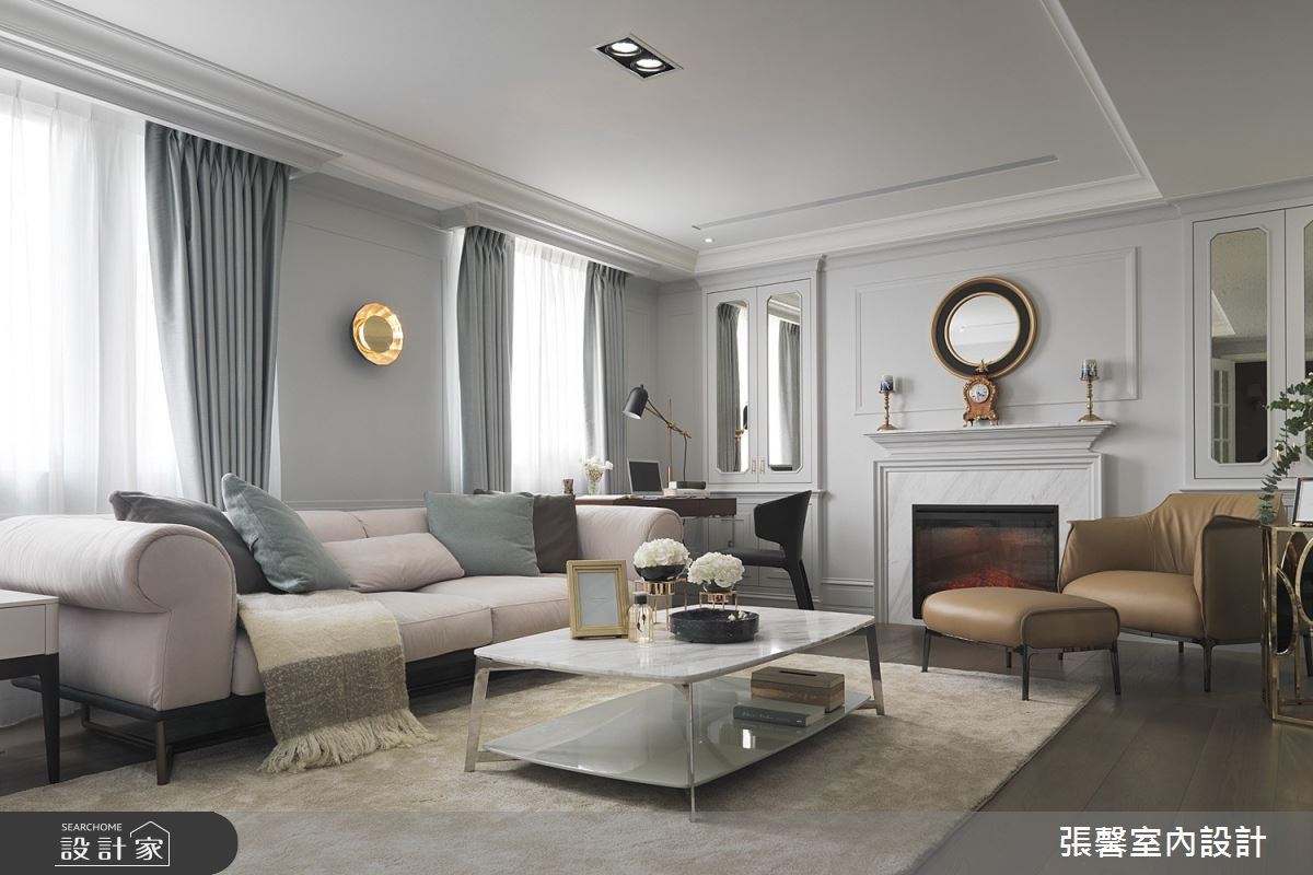 客廳場域則以淺色調為主,在灰藍的線板壁面裡,帶入美式風常見的壁爐設計,為室內增添些許暖意;柔美的櫻花粉沙發迎來浪漫氣息,對應沉著的大地色單椅、踩踏感良好的木地板,無形平衡視覺的強弱對比。推開美式線板拉門,女屋主的專屬琴房映入眼簾。淺灰色立面細膩點綴鏡面材質,映照著她沉浸於樂音中的忘我姿態。