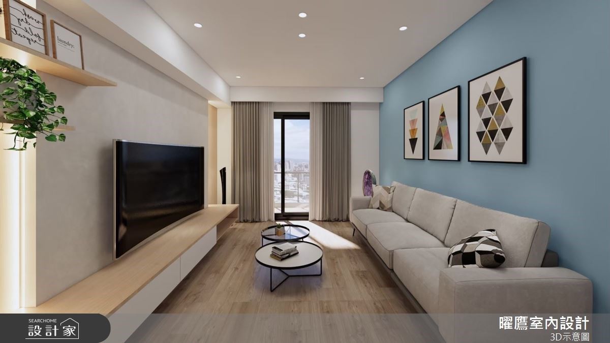 客廳公領域以純白色調為基底,搭配溫潤的木質元素和水藍色背牆,在簡約自然中,亦富有繽紛童趣的北歐氣息。而在收納的機能規劃部分,因應親子家庭大量的收納儲物需求,公領域特別打造超大型的步入式儲物櫃,結合層板和吊掛式設計,下層也保留了彈性自由的空間運用,既可吊掛外出衣物,也能收納家電、吸塵器,以及行李箱等大型物品。