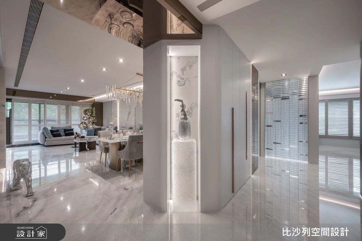 白色具有包容性,得以承載工藝與美感,為空間創造許多可能性,因此,以白色成為主軸,與灰色、藍灰色等低飽和度色調相互交融,並運用石材的微透光特性、玻璃磚的光線折射效果、茶鏡與金屬的反射性,營造出獨特的空間層次。這樣的設計,不僅突顯了光線的流動,也讓屋主珍藏的藝術雕塑品更加耀眼,成為空間中的視覺亮點。