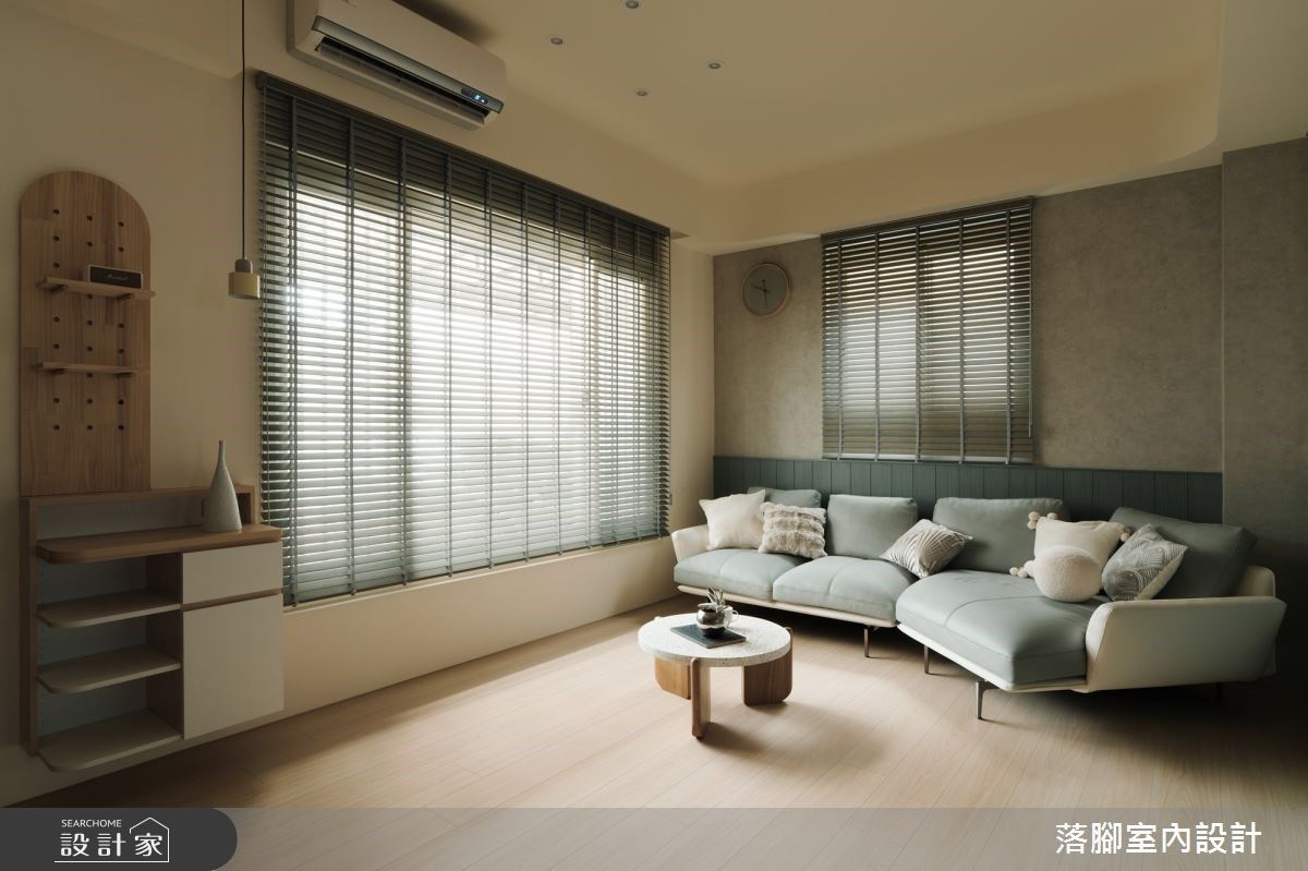 客廳以灰色特殊塗料搭配墨綠色木質襯底,凝塑現代時髦的空間基調,再搭配上綠色百葉窗簾,增添調光彈性的同時,也確保隱私性。
