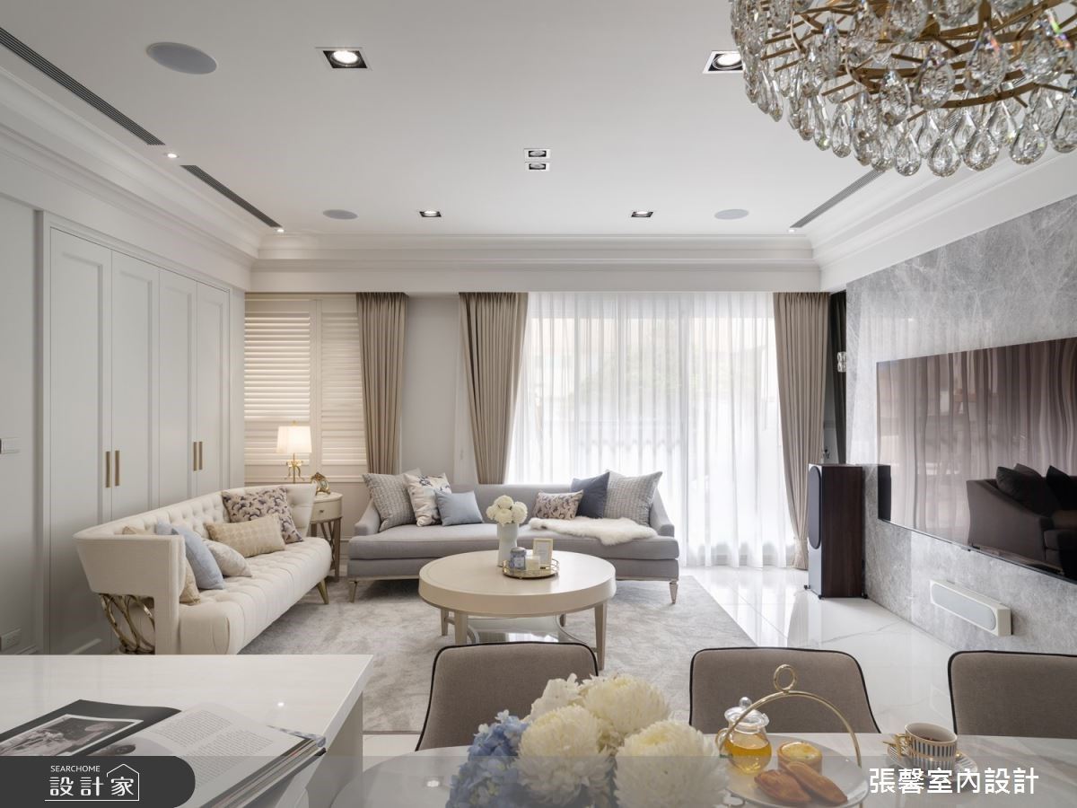 玄關採用深色石材襯底,兩旁櫃體則採用白色鋪陳,金色五金點綴,帶出奢雅大器感受,既滿足大量收納需求,也為私宅空間美式優雅的主軸破題。公領域延續淺色系基調,讓華美氣息充盈空間。客廳電視牆選用灰色石紋,斜切紋理巧妙聚焦視線。軟裝陳設則混搭復古與現代,讓空間表情更加精緻豐富。開放式餐廳結合輕食機能,讓日常聚會更加便利。熱炒區則隱於玻璃拉門之後,完美避免油煙疑慮。為讓公領域看起來更寬敞清爽,設計師將收納規劃於廊道中,空間美學更升級。