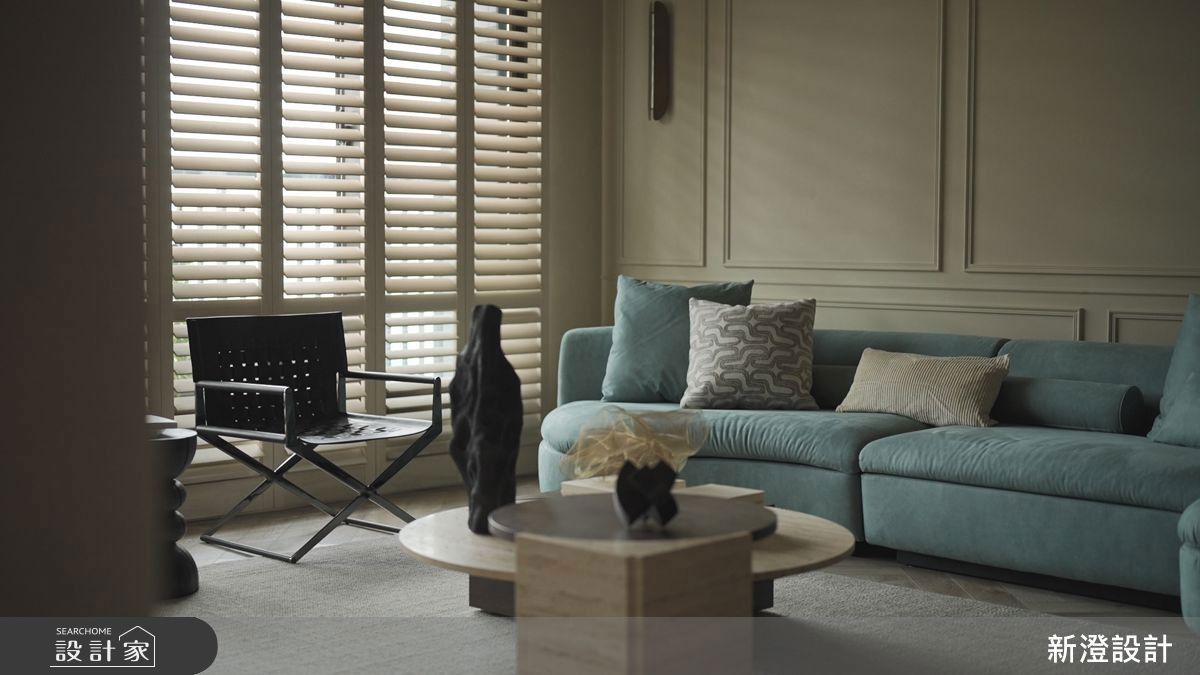 入室玄關設置金屬網屏風,為了配合中南台灣的風俗民情,避免開門見灶的疑慮。另一方面又賦予端景意象,當光線穿透其中,光影、金屬構建、石材,將三者搭配,營造出獨特的視覺效果。客廳設計以歐洲古蹟修復的塗料施作,柔霧膚色調建構安靜低調的氛圍。整體牆面捨去傳統法式門框雕花,改用隱藏門簡約修飾,搭配百葉窗納入日照,以柔光包覆,搭配燈光層次的調整,讓每一段日常都在不同光影之中自然展開。