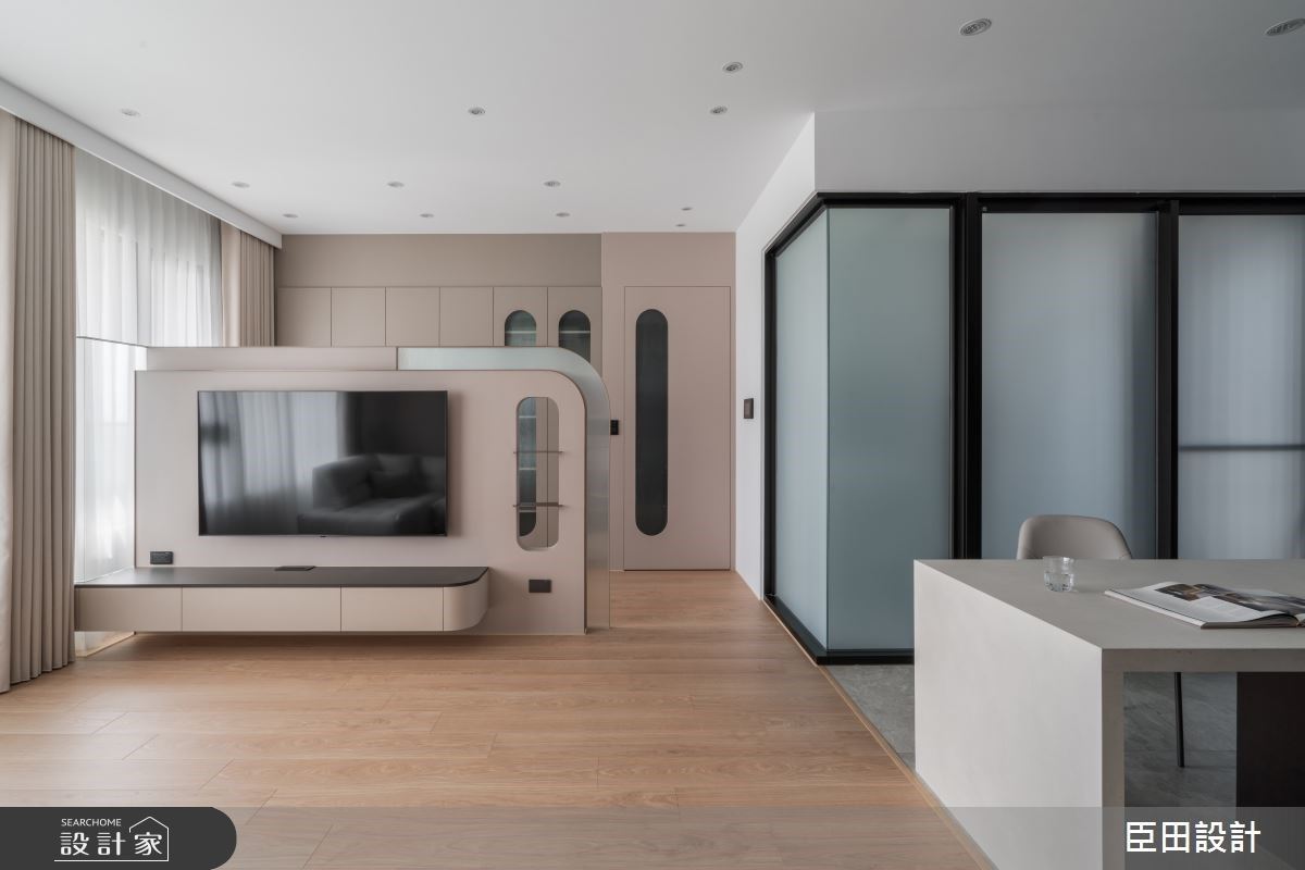 客廳與主臥空間利用一座特別設計的半高電視牆作為隔間。這道半高電視牆除了具備隔間功能外,上半部留空設計更增添視覺上的輕盈感,也讓採光可以自然流通於各個空間,讓室內更顯明亮通透。電視牆後方設置了大量的收納櫃,門片上運用半透明的霧面材質,營造出現代又不失質感的輕奢美感,也能有效減輕整體櫃體的厚重感,達到視覺的平衡與美觀。
