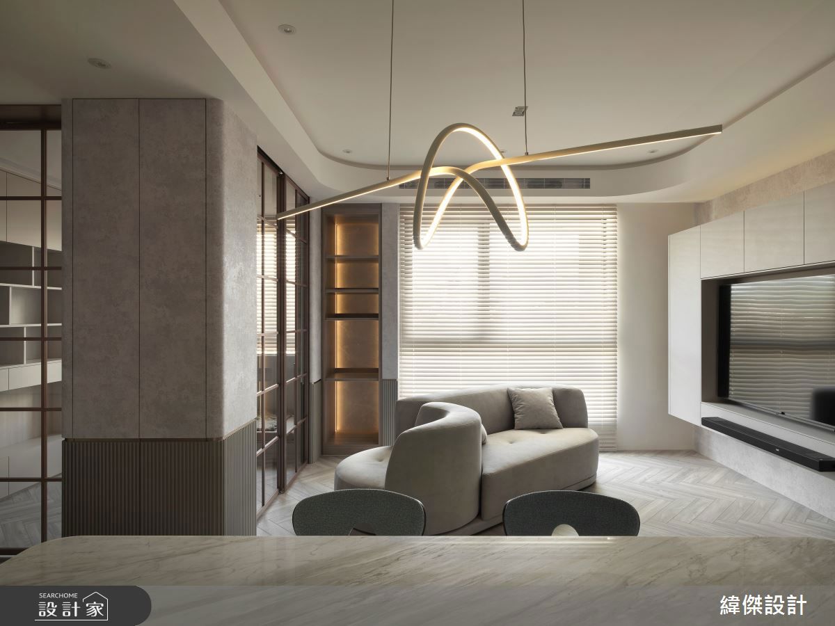 客廳與餐廚區運用圓弧的線條及懸浮式的設計語彙,呈現出輕盈的視覺感受。電視牆以細膩的質感搭配鍍鈦金屬與間接燈帶,柔和又奢華的質地令人一見傾心。特別的是,客廳與書房之間特別規劃了格子窗拉門,既保持空間通透性,又巧妙營造出優雅的法式氛圍。訂製的雙向沙發打破傳統框架,無論是家庭聚會還是個人放鬆,都能靈活調整使用方式,讓日常生活更加舒適自由。