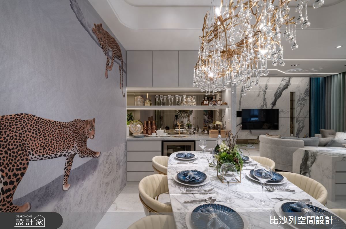 餐廳空間則巧妙融入叢林與森林的靈感,牆面鋪陳著手繪美洲豹圖騰,搭配圓梯形餐桌與金色樹枝造型的水晶吊燈,營造出獨特的用餐氛圍。餐櫃底部以茶鏡襯底,端景牆選用綠條紋的翡翠石材,與竹林的視覺意象相互輝映。鍍鈦材質的陳列架與威尼斯鏡作為背景,加之走廊端景處的斑馬叢林圖騰,讓人彷彿置身大自然中。