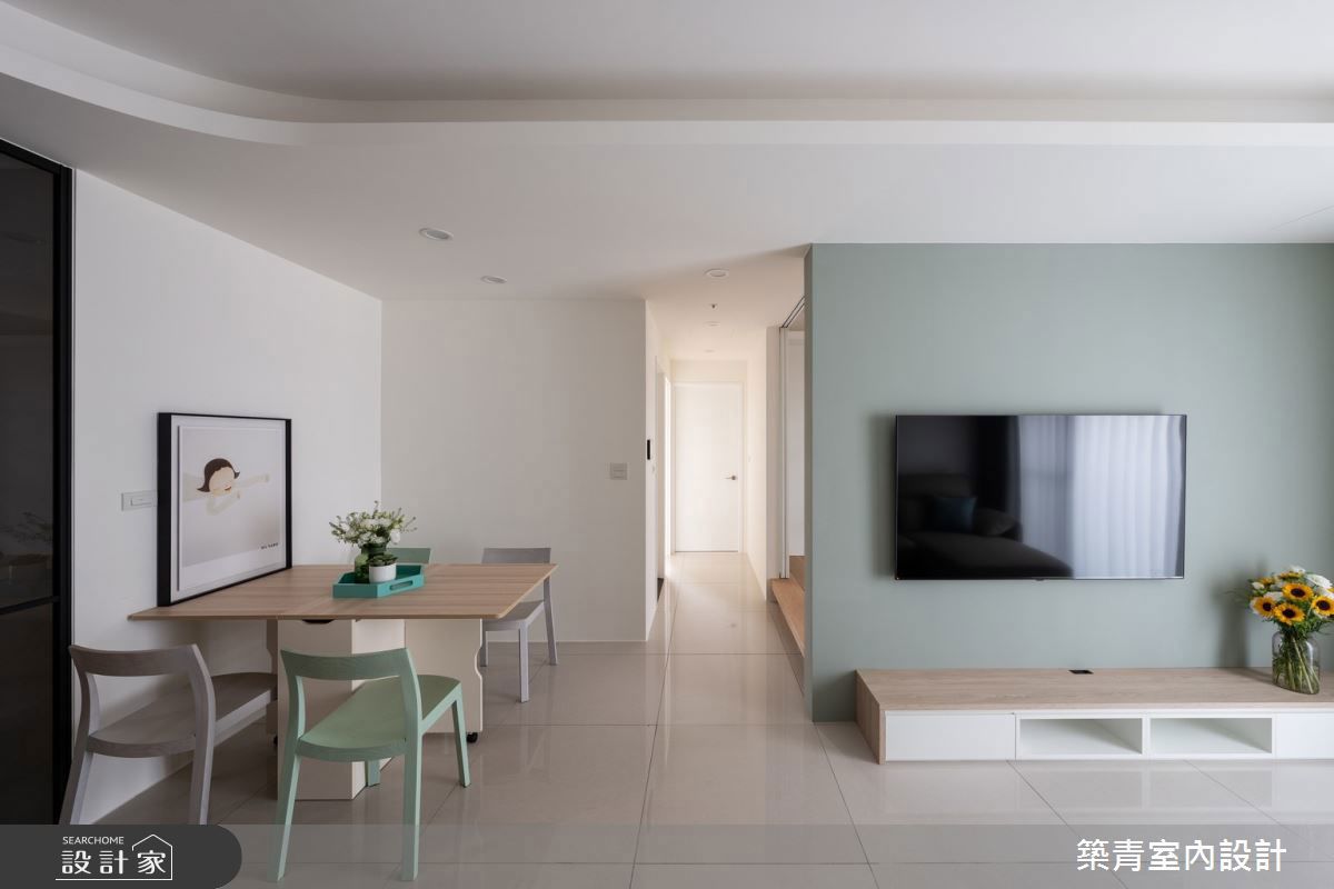 玄關規劃整排隱藏式收納櫃,佐以內嵌展示層架及綠意點綴,實現機能與美學的完美結合,一旁設有實用的穿鞋區,提供歸家時的舒適緩衝,空間以米白、淺灰與木質構築核心語彙,透過清水模系統櫃與木地板的搭配,呈現溫潤而現代的視覺感受。公領域開放式設計,玄關、餐廳與客廳一氣呵成,動線流暢,餐廳配置可折疊延展的伸縮餐桌,輔以跳色餐椅與綠色配飾,點亮年輕氛圍,客廳牆面則以灰綠色乳膠漆營造柔和視感,結合壁掛電視與矮櫃,實現簡潔開闊的空間效益。玻璃拉門圍塑的廚房,視覺穿透也可適時隔絕油煙飄散,和室架高地板,下方設有上掀式儲物空間,以玻璃摺門彈性隔間,一秒化身客房能同時確保隱私。