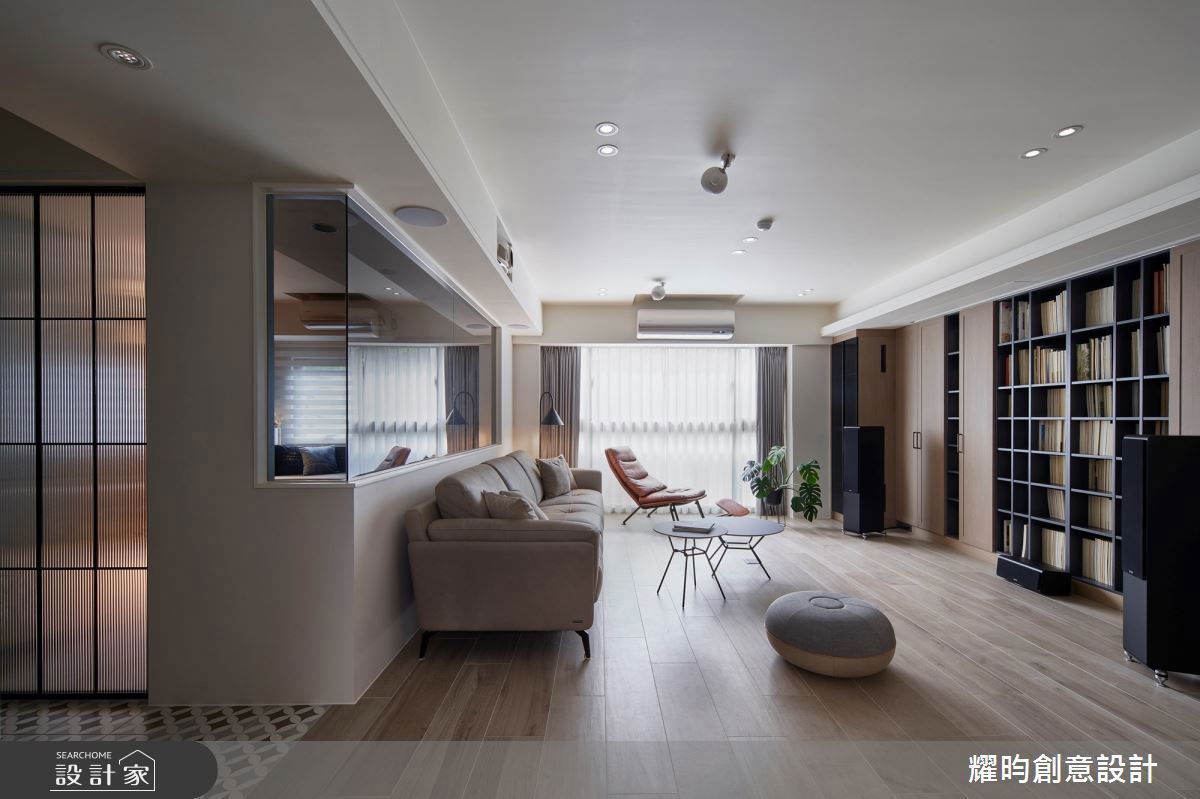 原本過大的迎賓玄關透過一道長虹玻璃拉門巧妙地劃分出一個獨立且開闊的書房,70坪空間規劃5+1房,不僅維持每個房間的坪數的舒適度,特別的格局規劃也維持公領域的開闊感。書房與客廳之間採用了半截式的玻璃帷幕設計,這項改動不僅串聯了兩個空間,更讓自然光線與視線得以自由穿梭,營造出一個通透明亮、毫無阻礙的居住環境。內部整面牆的書櫃足以容納屋主豐富的藏書,替喜愛閱讀的男屋主創造一個專屬的舒適休憩空間。
