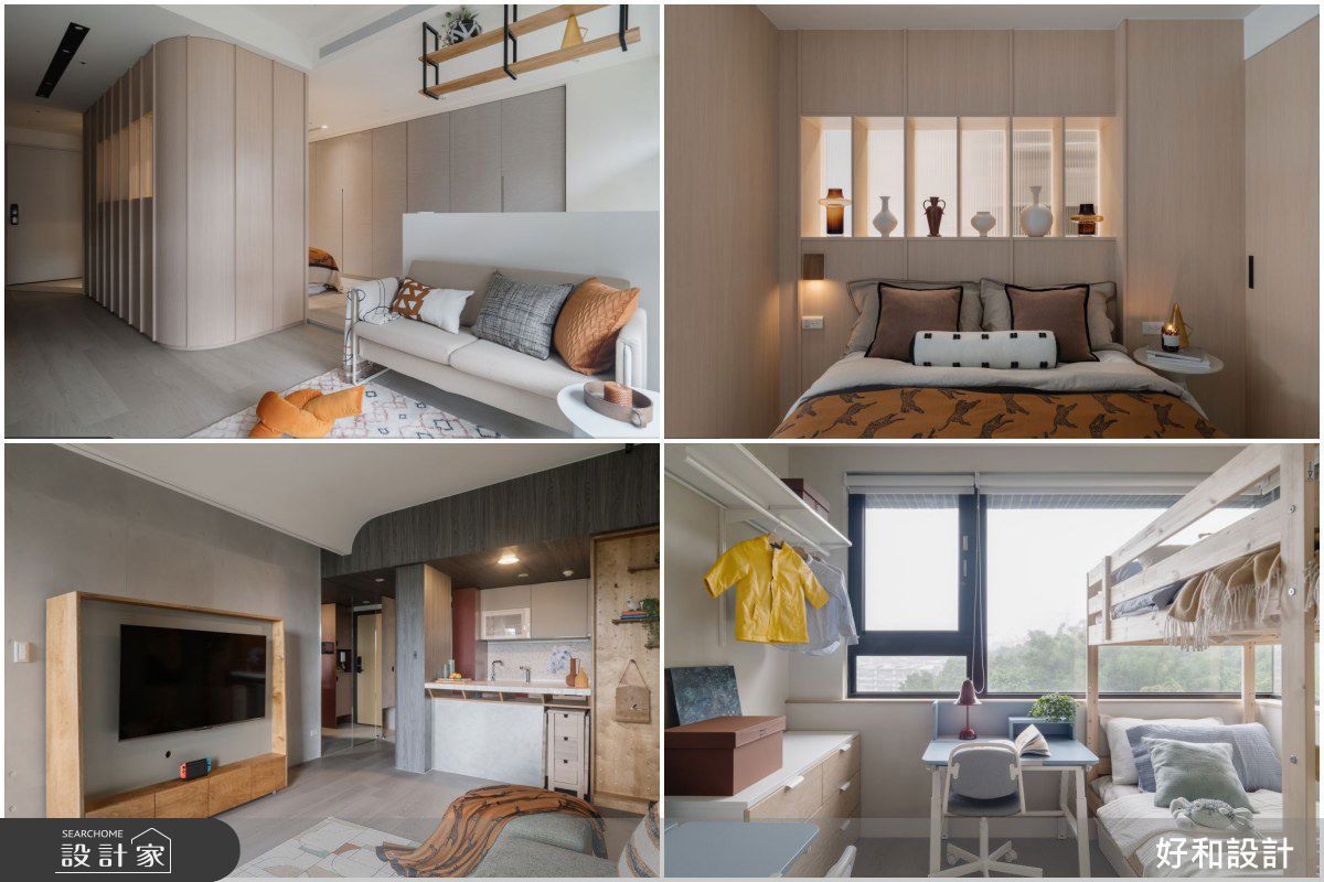 面對許多微型住宅優化採光受限、空間狹小與收納不足的通病,好和設計何佳翰總監將櫃體牆體化,讓 14 坪小宅沒有實牆隔間卻擁有舒適的廳房格局。而僅 17 坪的自宅空間要容納一家四口,更透過收納集中規劃與活動式設計,讓微型住宅也能住得舒適不擁擠。