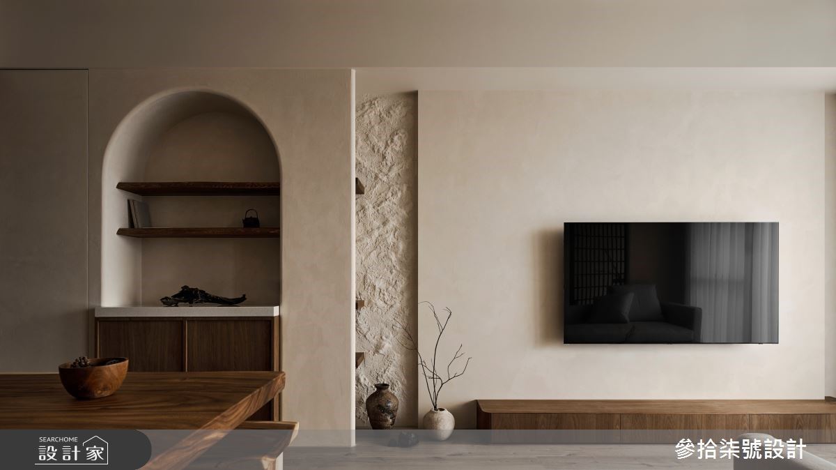 全室以米灰階特殊塗料為基底,搭襯溫潤的木質地坪,適時保留居家空間所需的暖度;入門玄關處規劃行走廊道,打造沉澱心緒的過渡場域,一字型公領域則擺放活動式家具軟裝,明確客餐廳的場域分野,實木餐桌椅與上方的造型燈飾相呼應,備餐櫃選用弧形壁龕造型,納入展示及收納機能,同時內嵌暖色的間接光源,讓此隅成為天然的空間景深;臨窗處規劃為休憩客廳,刻意留白的電視牆與落地的木質機櫃,延伸了開闊敞亮的視覺饗宴,電視牆側邊更以紋理鮮明且略帶粗獷感的人造石妝點,即使是小坪數的空間,也能處處都有精緻的端景畫面!