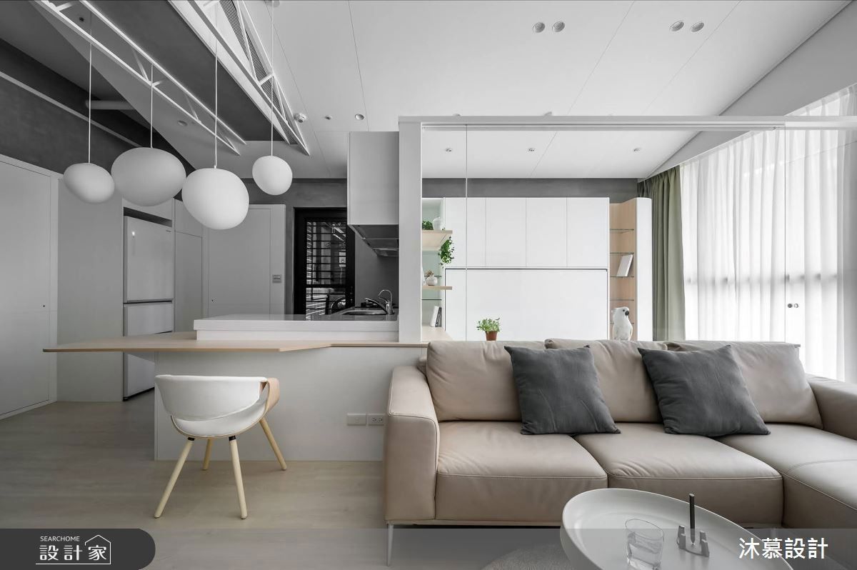 設計師改善了原有採光不佳的問題,運用開放式設計和通透玻璃隔間,使客廳、餐廚、書房視野不受限制,進入室內望眼即是一片清新明亮。鸚鵡棲息的籠子設定於玄關旁,並整合了階梯狀棲木,方便鸚鵡的活動與停駐休憩,也使生活畫面更加清爽整潔。