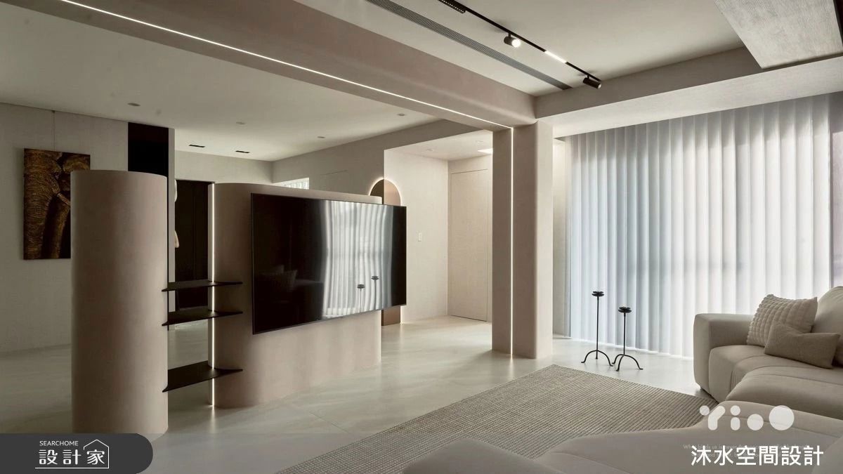老宅在外觀上褪去了歲月的痕跡,經過補強與白色漆作,展現出俐落、簡約的現代感,與周遭山景完美融合。而步入一樓公共空間,迎面而來的是自然開闊的氛圍。設計師以「自然現代風」為概念,運用開放式設計將客廳、餐廳和廚房串聯,並藉由庭院的良好採光,放大整體的空間感。客廳區域延續自然溫潤的氛圍,電視牆以大理石搭配側邊特殊塗料展現層次, 15度斜角的設計,讓動線與尺度更顯開闊。開放式中島餐廚區的尺度特別加大,成為親友聚會交流的中心點,巧妙利用圓弧造型進行修飾,降低了柱子的存在感,讓空間動線與視覺都更為流暢。