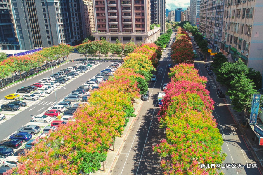【新北市訊】秋節時期,林口區道路上的台灣欒樹也悄悄披上新衣,千餘棵的台灣欒樹金黃、粉橘、艷紅的蒴果隨風搖曳,在湛藍天空襯托下,營造出繽紛景致,成為隱藏在林口都市的文青祕境大道。