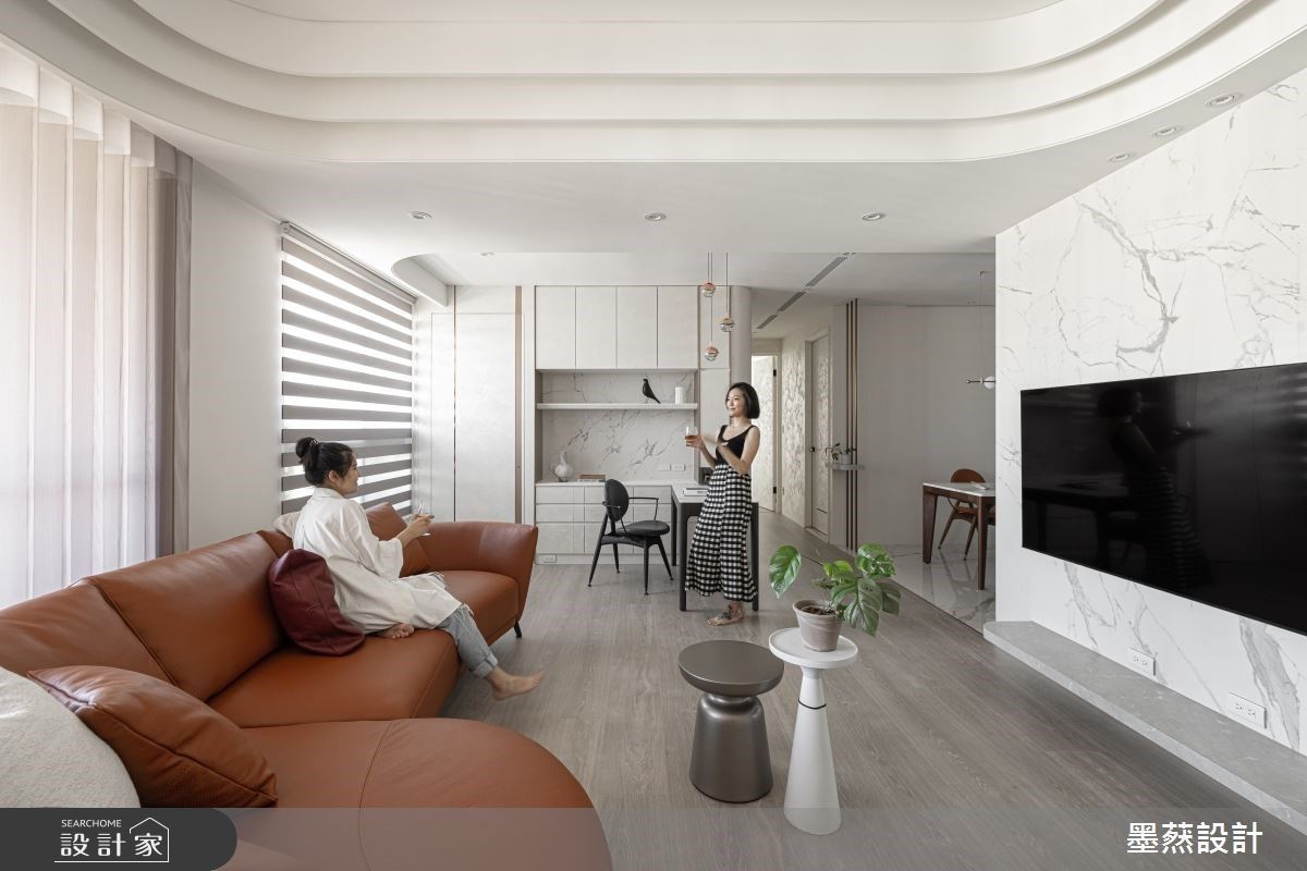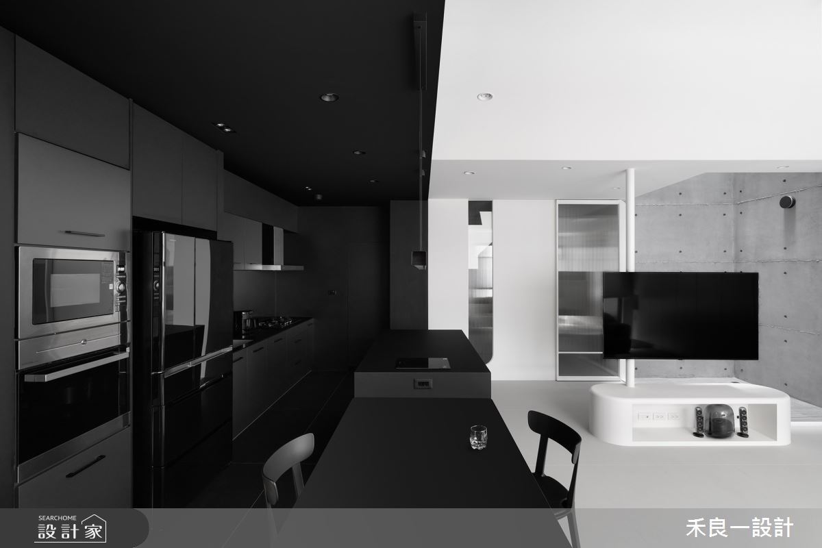 以色塊取代輕隔間!黑與白創造無界廳區,從天花到櫃體的弧形設計讓透天別墅自由度大升級
