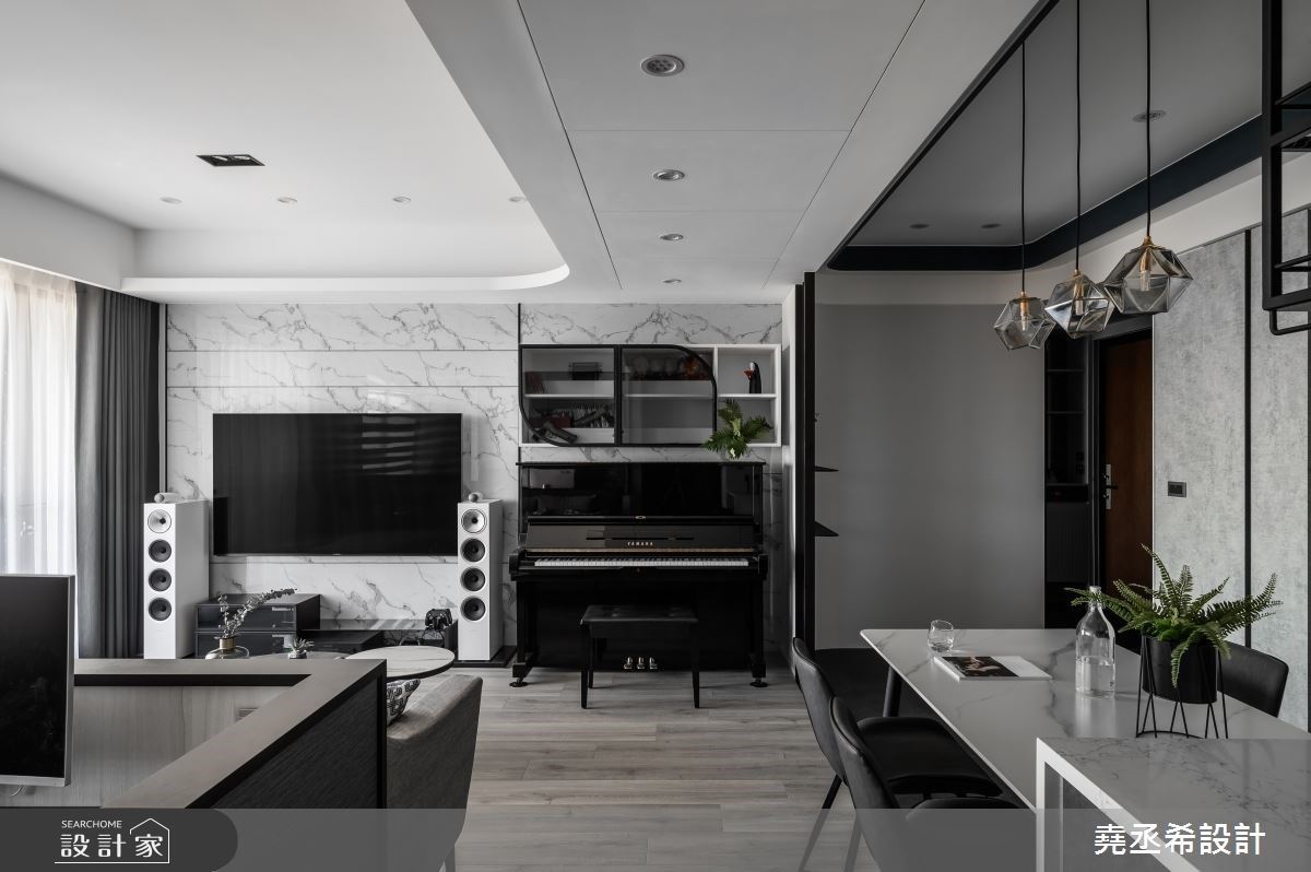 天花鏡面挑高延伸視覺尺度,30坪混搭宅以金屬與特殊漆營造質感層次