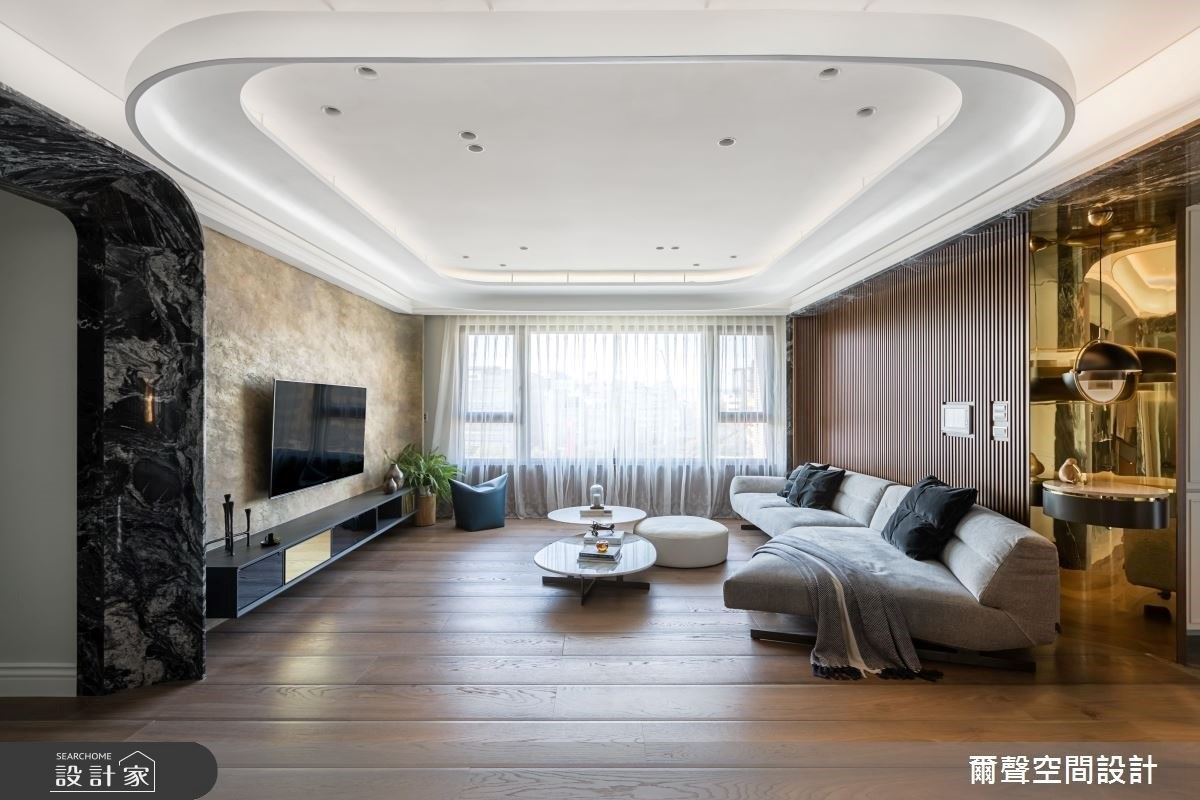 用對紋大理石玄關引人入室!雙面落地窗,讓 45 坪毛胚屋陽光滿室!