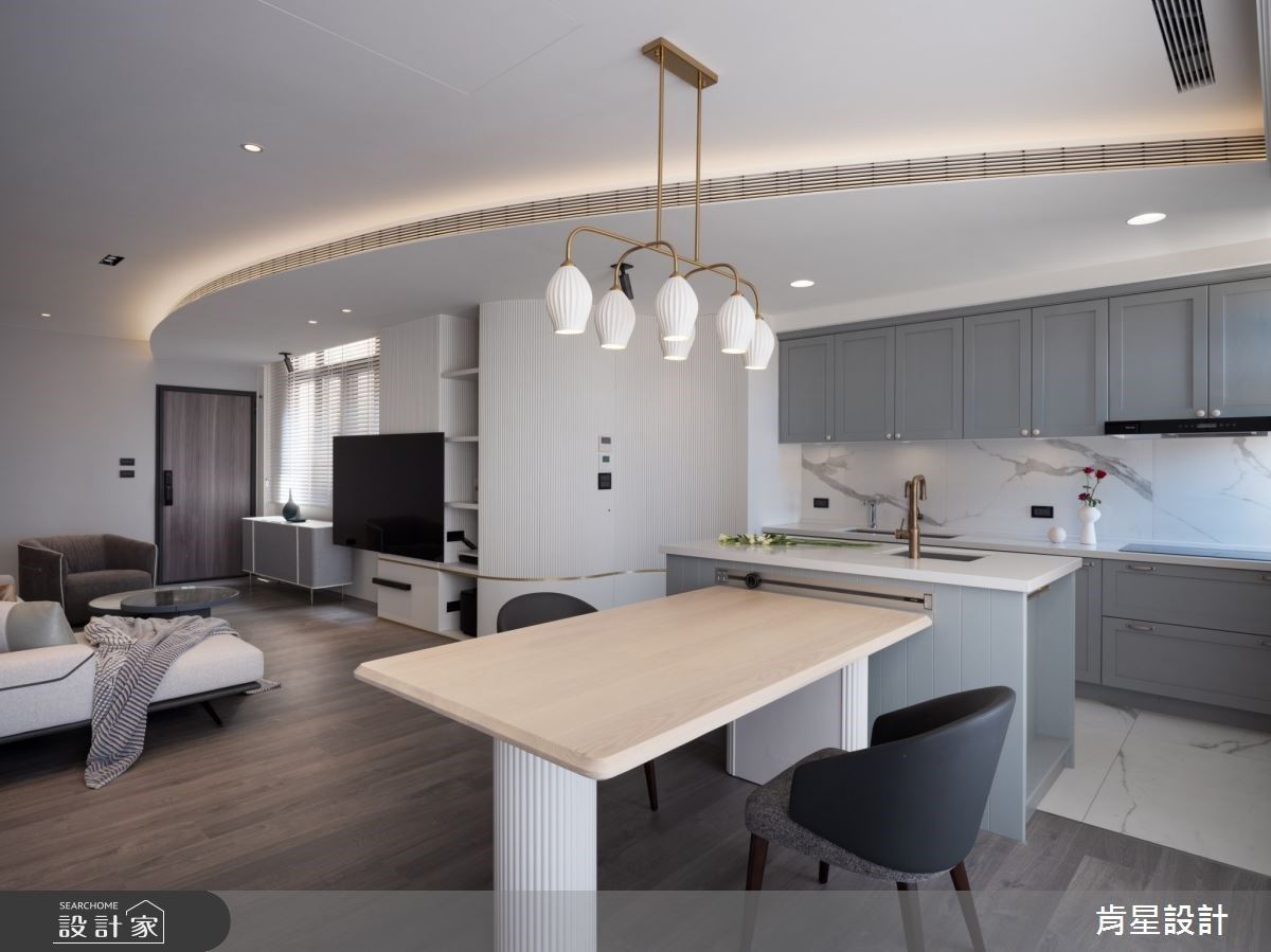 老屋在圓弧串聯的客廳及中島廚房還原美式風格,享受高級臥房、浴室的渡假氛圍。
