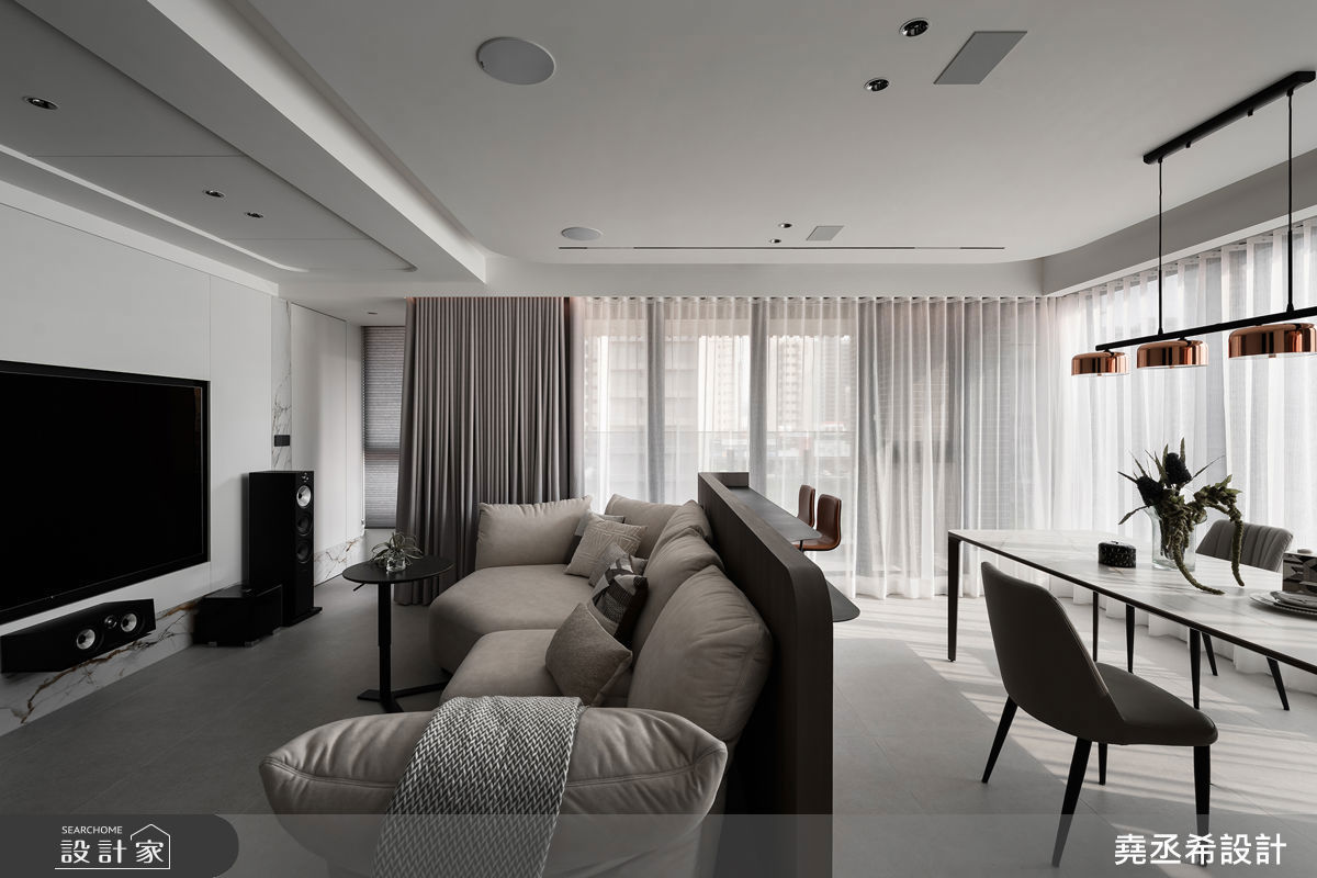 34坪三房現代宅用半開放設計創造空間延伸感,雙回字型動線提升生活效率