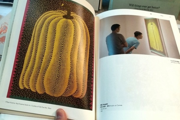 每一個瓜瓣上的圓點,都是由大至小的交錯組合,看久了如同一根根的尖刺般。雖然南瓜在草間彌生的腦海中,不若食人花般張牙舞爪,是個圓滾滾、殺傷力甚低的溫暖存在。但畢竟仍是那個環境的植物,若一不留神,還是會被弄傷的。