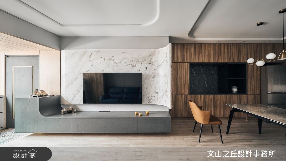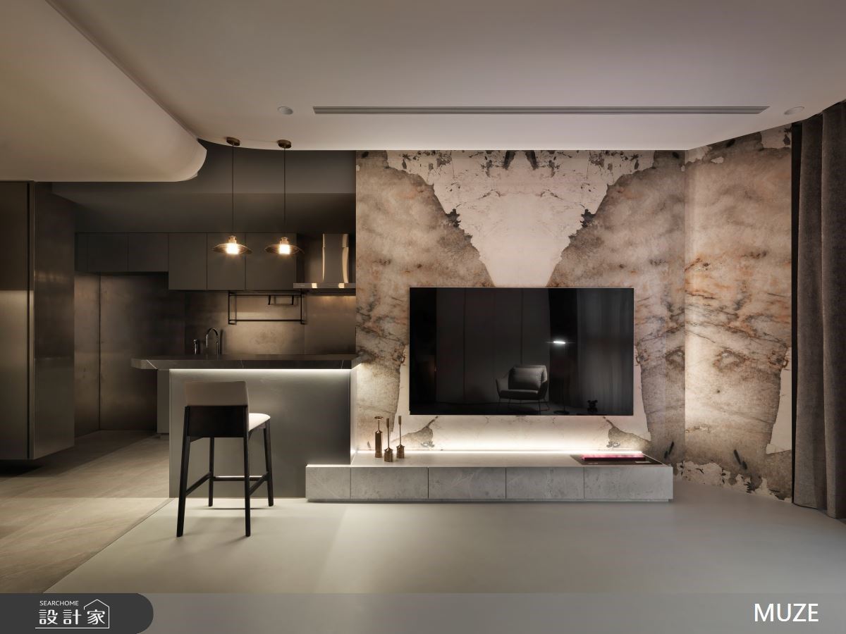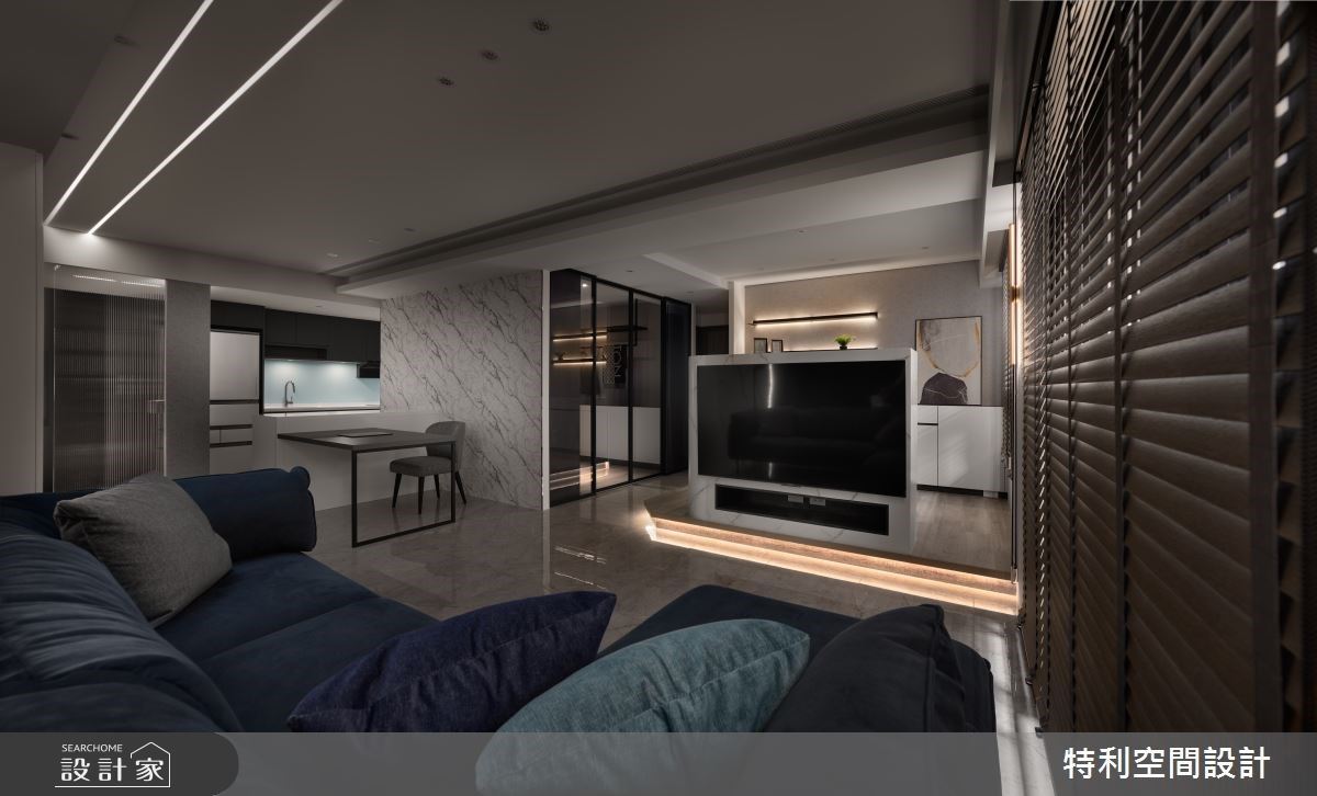 揭開電影序幕般現代風尚宅!對稱拚花電視牆、中島串客餐廳動線,燈帶醞釀質感場域氛圍