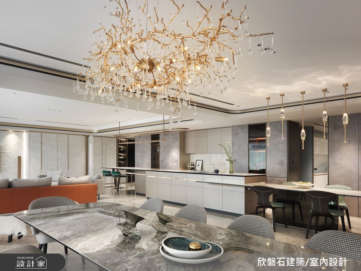 用光影雕塑空間!竹北 60 坪輕奢風住宅,琥珀奢石主牆搭配 Venicem 吊燈,定義低調不張揚的生活哲學