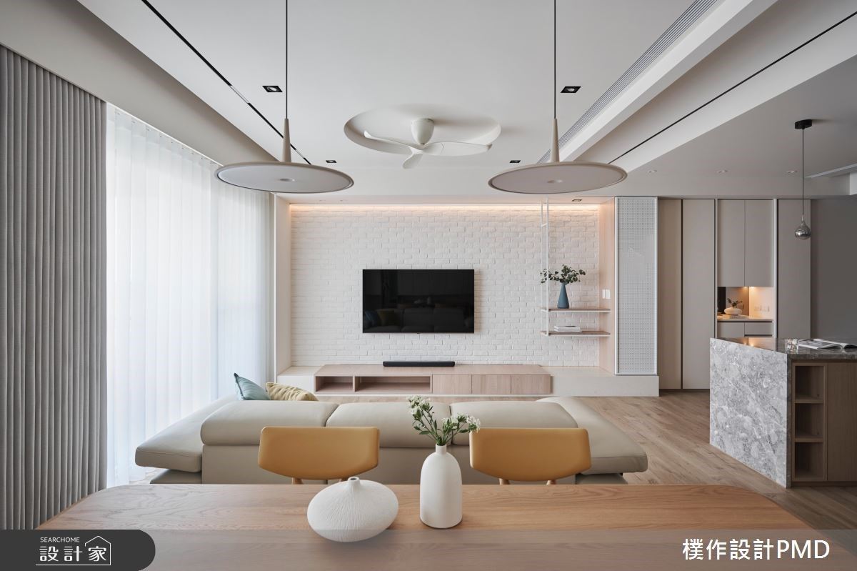 療癒木白系居家吹散壓力!時尚中島、酒櫃牆設計,烘托愉悅美好的三口之家