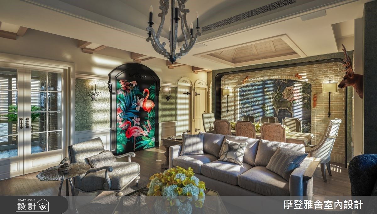 以獨一無二的高級訂製美學空間著名的汪忠錠、王思文設計師,以藝術感十足的專業設計,以及講究隨手收納的實用機能,讓居者生活井然有序;在兩位鄉村風天王、天后的的強強聯手之下,運用訂製手繪絲綢壁紙、手工雕花線板、仿古吊燈、藝術手繪壁畫等材質,為 45 坪居宅注入品味非凡的森林系歐式莊園氛圍。